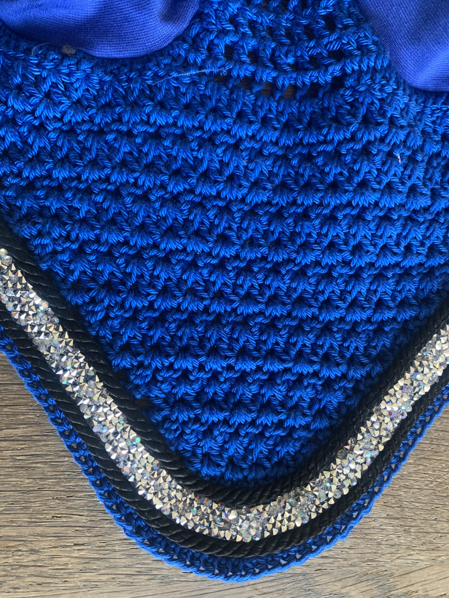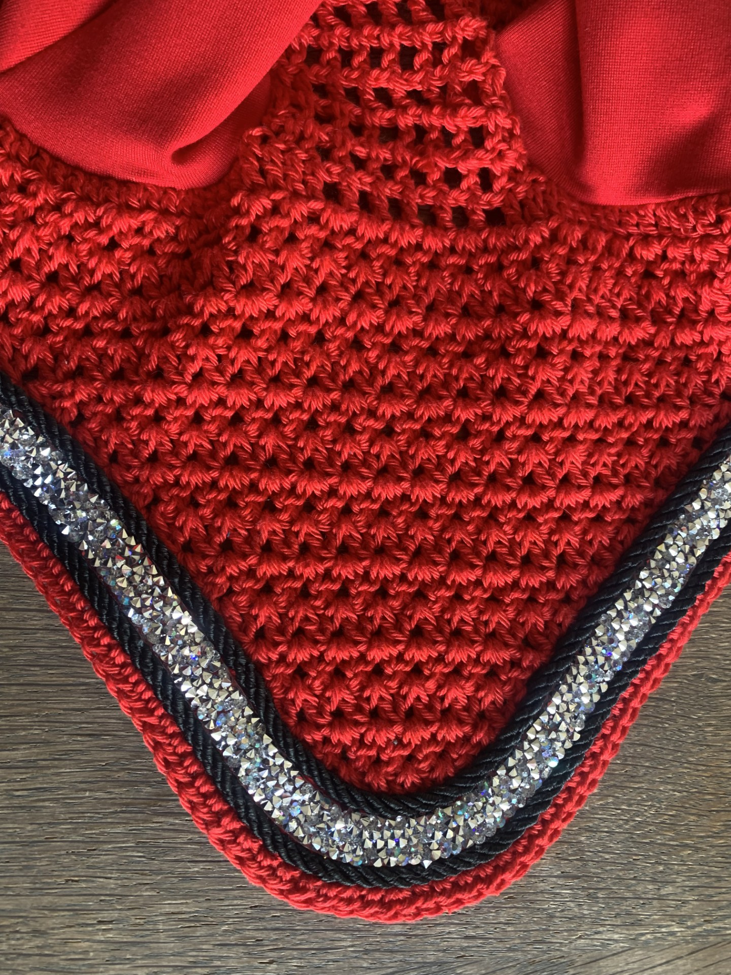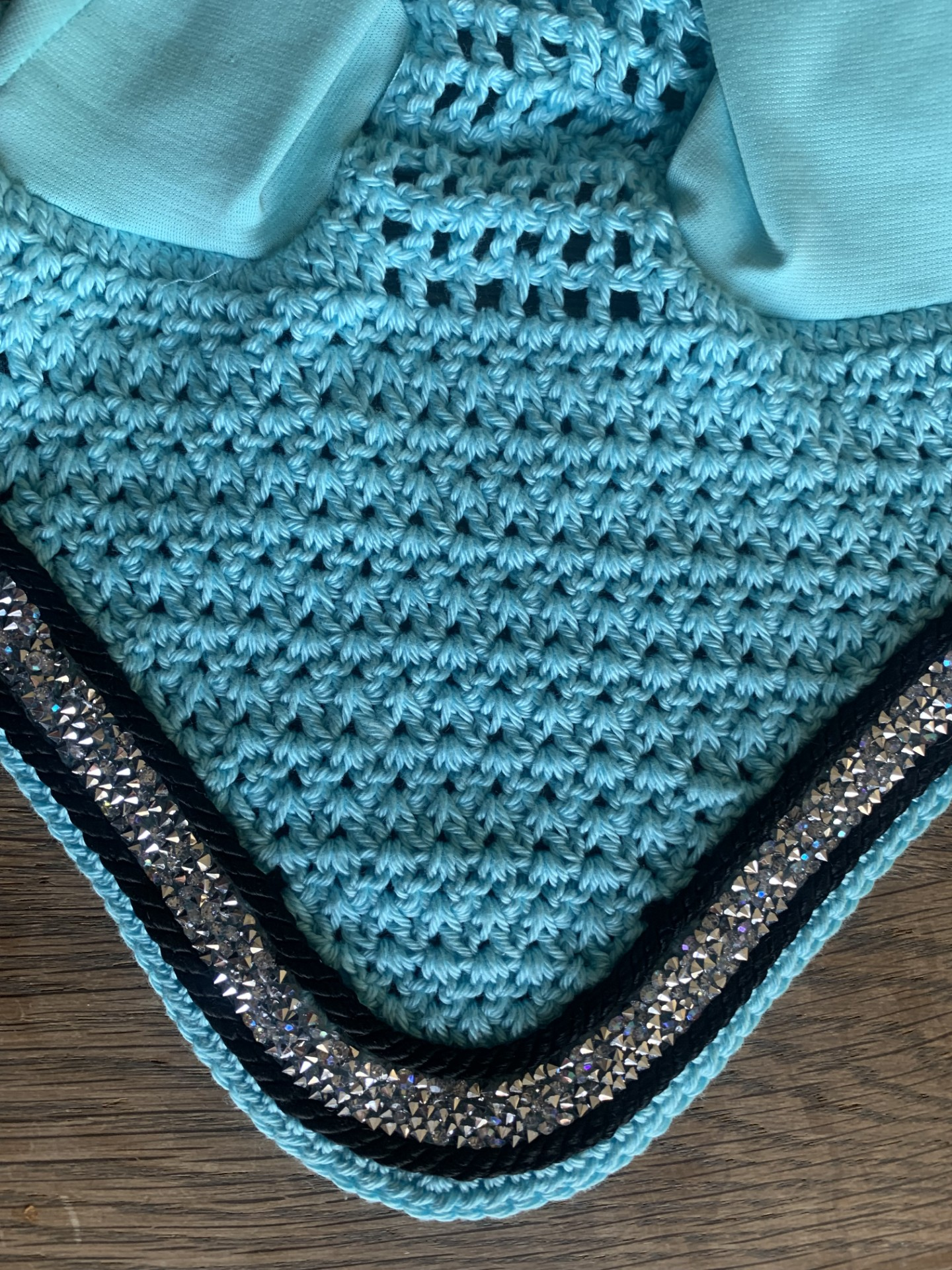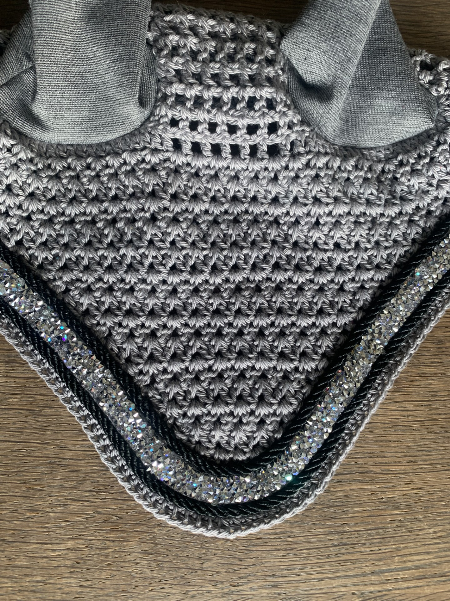 Oornet model ‘Druppel’ met zilverkleur strassband en zwart koord. Is verschillende kleuren haakwerk verkrijgbaar.